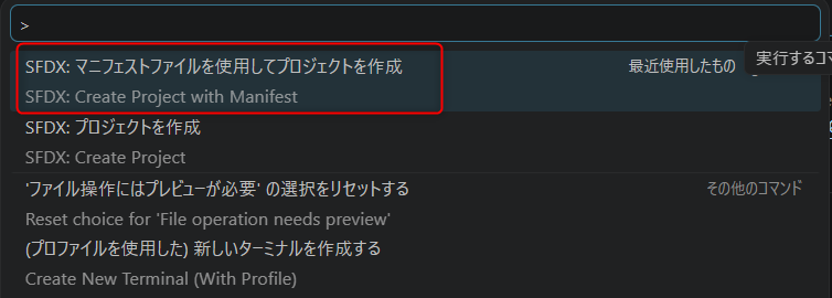 VSCode上でコマンドパレットを開き(Ctrl+Shift+P)、SFDX: マニフェストファイルを使用してプロジェクトを作成 (Create Project With Manifest) を選択します。