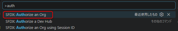 再度コマンドパレットを開き(Ctrl+Shift+P)、SFDX: 組織を認証 (Authorize an Org) を選択し任意の組織名を入力します。