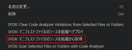 そうするとSFDX:マニフェストファイルのソースを組織から取得とあるのでそちらをクリック